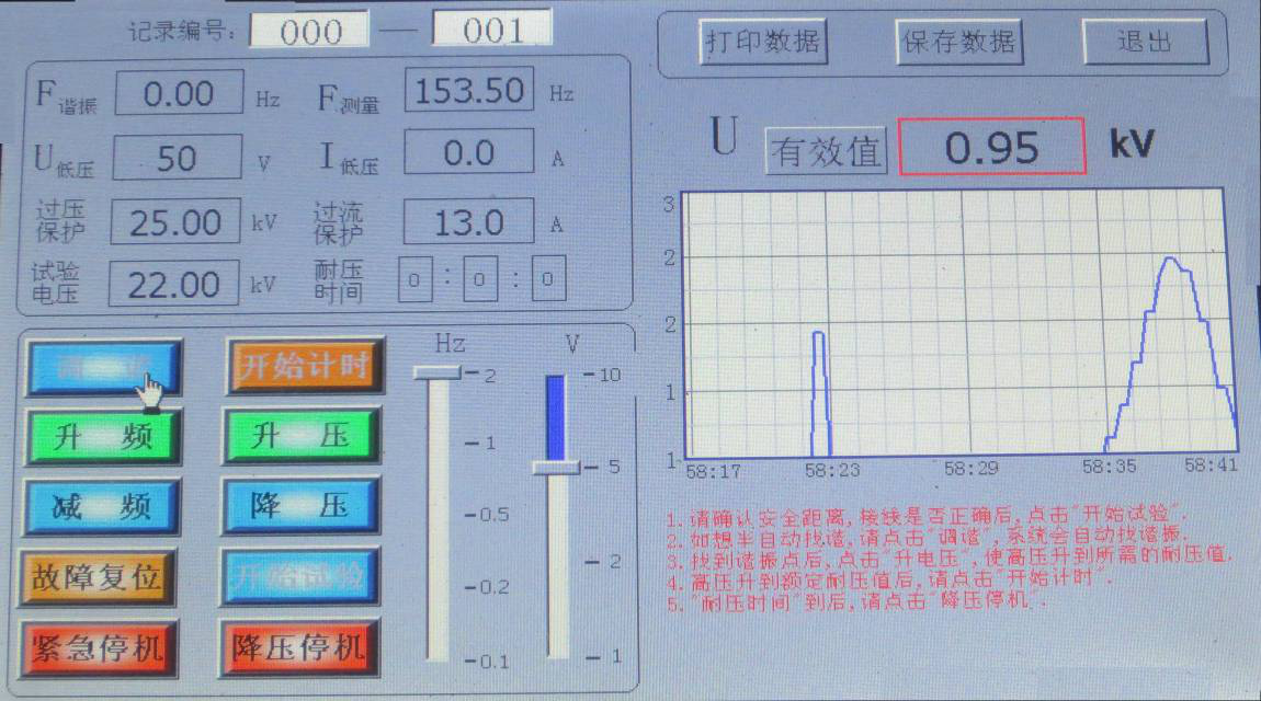 如不想自動找諧振點,先點擊“升電壓”,將“U低壓”升到50V,再點擊“升頻率”來找諧振點,找到諧振點后,點擊“升電壓”, 顯示界面如圖所示。