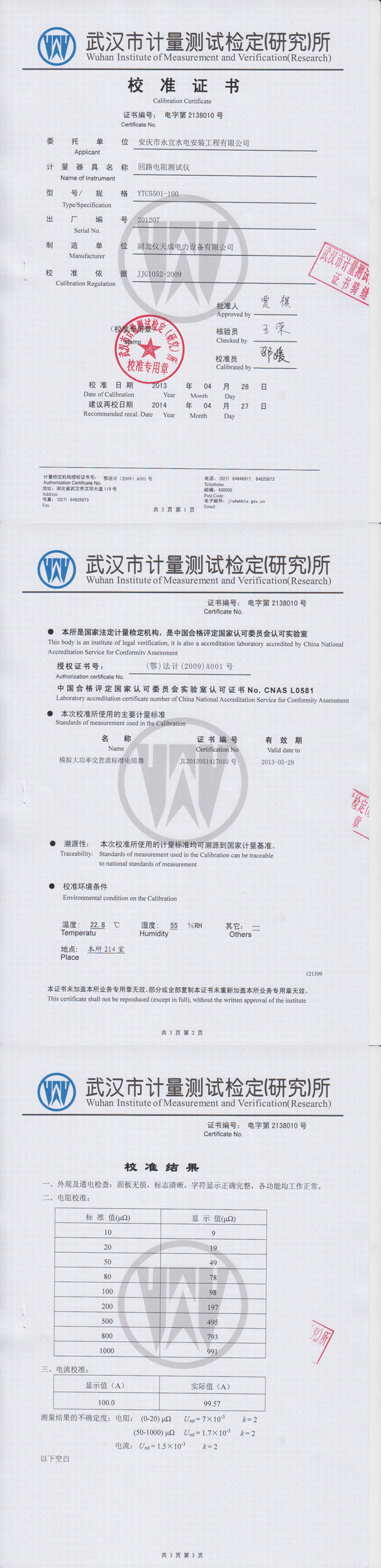 YTC5501-100回路電阻測(cè)試儀資質(zhì)證書